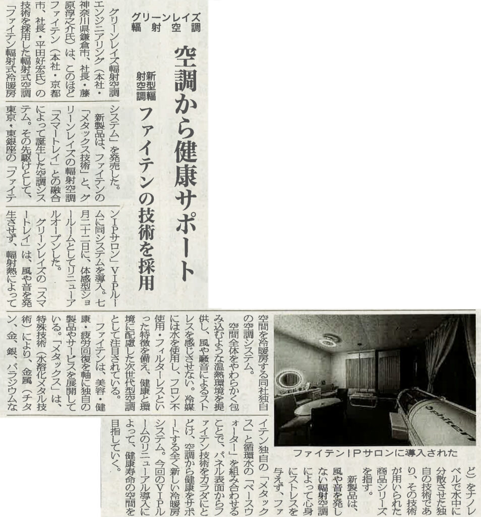 株式会社グリーンレイズ輻射空調エンジニアリングの技術が、ファイテン株式会社様の「IPサロン」に採用され、この取り組みが 熱産業経済新聞2025年9月5日号) にて紹介されました。